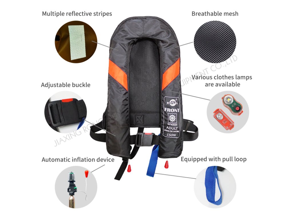Nafukovací záchranná vesta 150N s automatickým i manuálním nafukovacím mechanismem je určena pro bezpečné použití na moři, řekách i jezerech. Splňuje EC certifikaci a je vhodná jak pro profesionální námořní použití, tak pro rekreační plavbu.