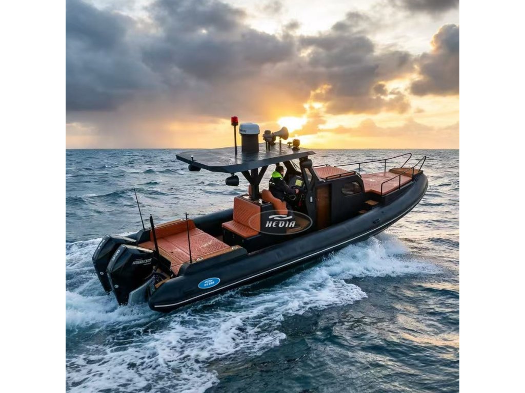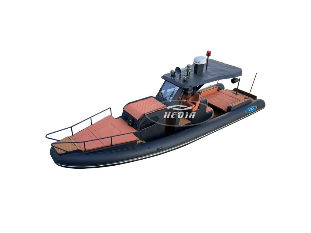 Profesionální 35stopá nafukovací loď ORCA RIB1050 s hlubokým V hliníkovým trupem, uhlíkovými tubusy a kabinou.